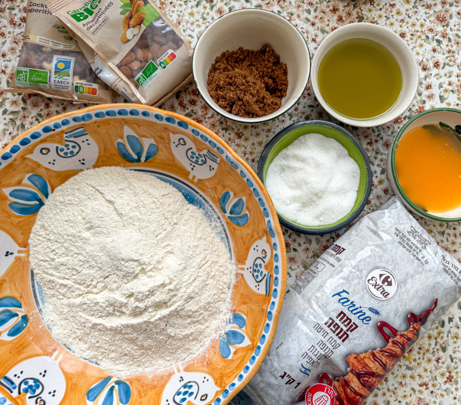 בקערה נערבב: קמח, אבקת אפייה, סוכר חום ולבן, מיץ תפוזים, גרידת תפוז, שמן זית ו-תמצית וניל, נערבב עד איחוד הבצק נעים למגע, נוזיף את השקדים ומיקס האגוזים, עד שהבצק “יבלע” את כל התערובת.