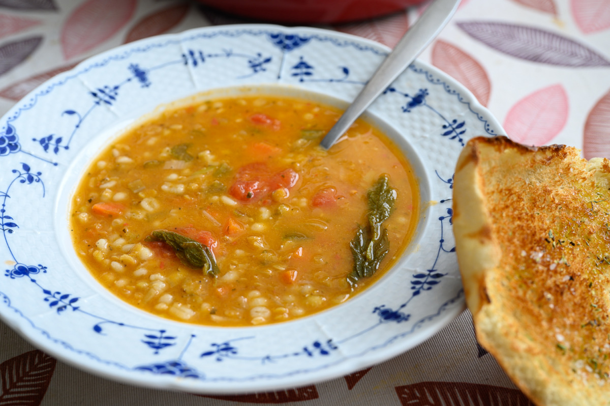 נוסיף שום קצוץ, עגבניות שרי חצויות, קליפות לימון ונערבב, נוסיף גריסים, עדשים ומלח, נוסיף מים רותחים, נערבב, נביא לרתיחה ללא מכסה (מי שרוצה זה הזמן להשיל בקלילות את קליפות השרי-אני אוהבת), זר קטן של נענע או בזיל או כוסברה – 30 דקיקות אש בינונית לא מכוסה