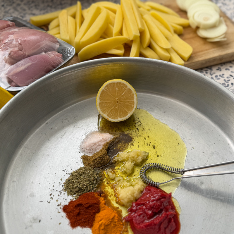 כפית מכל תבלין: אורגנו, כמון, כורכום, פפריקה, (אפשר תבלין שווארמה 2 כפיות)