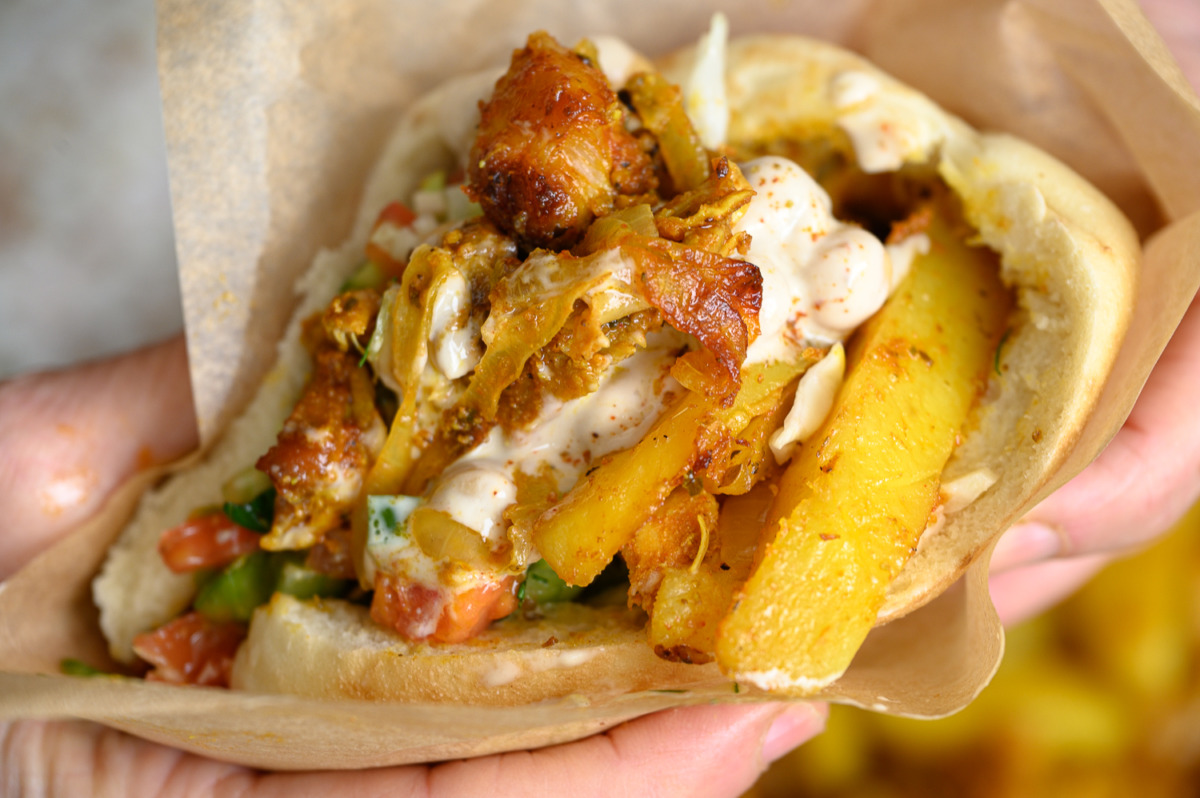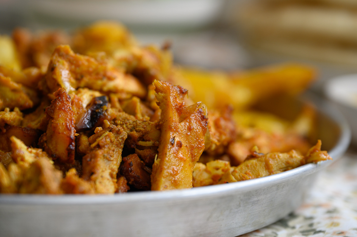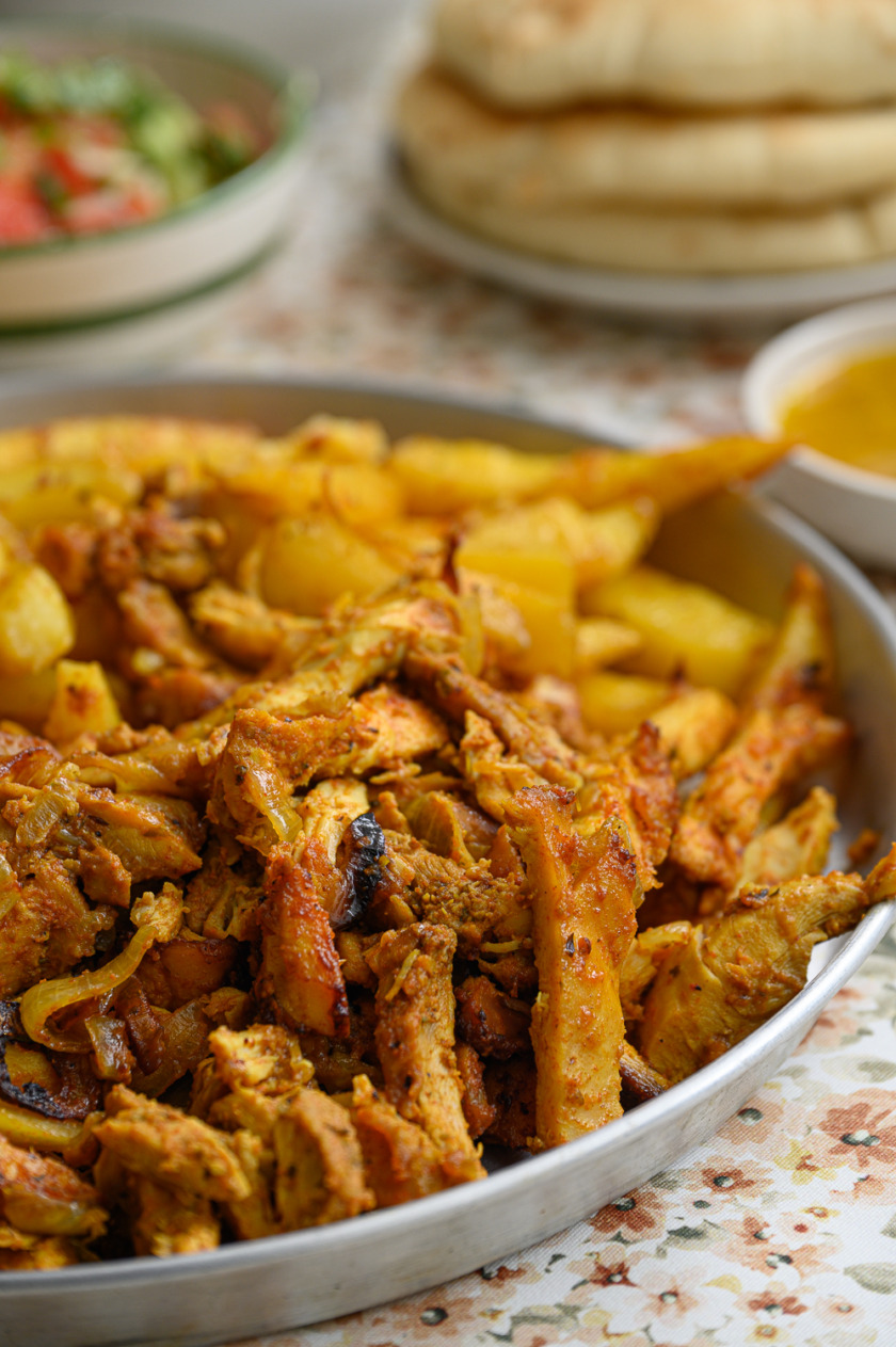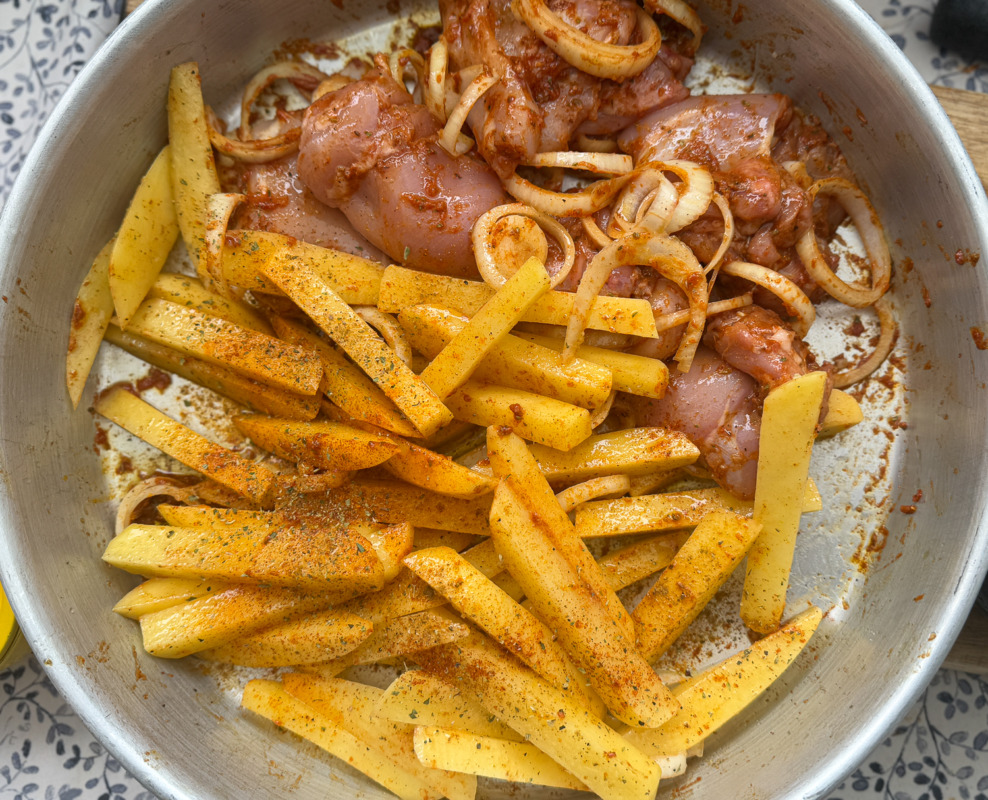 לריקי טריקי של השווארמה בתבנית, אני מוסיפה תפוחי אדמה חתוכים לצ’יפסים בתחתית, הם נהיים רכים ונימוחים. להיט
