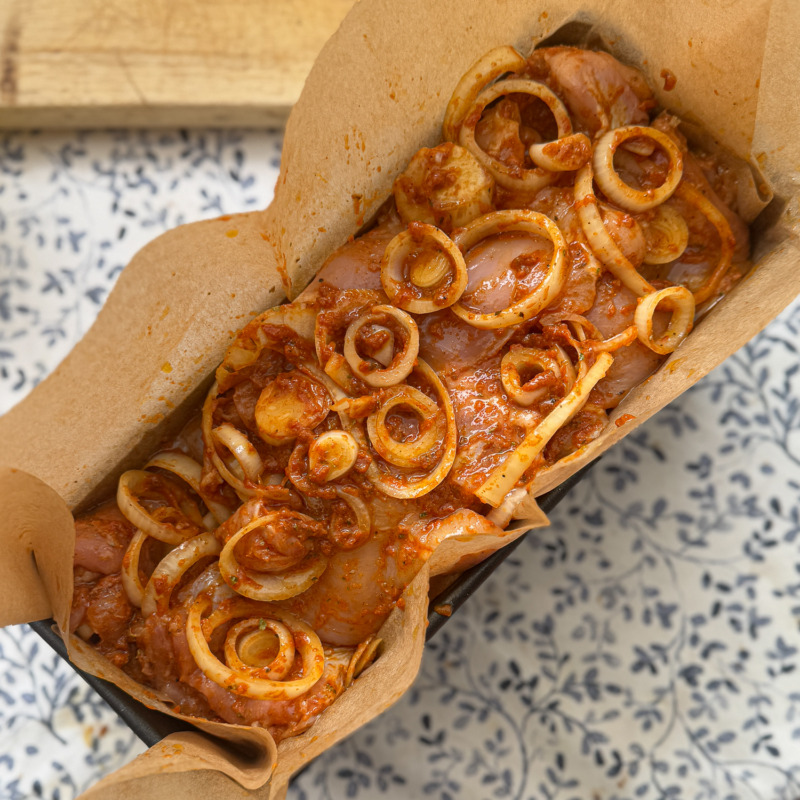 נערבב היטב את נתחי הפרגית עם שמן זית, בצל, שום, רסק ותבלינים
