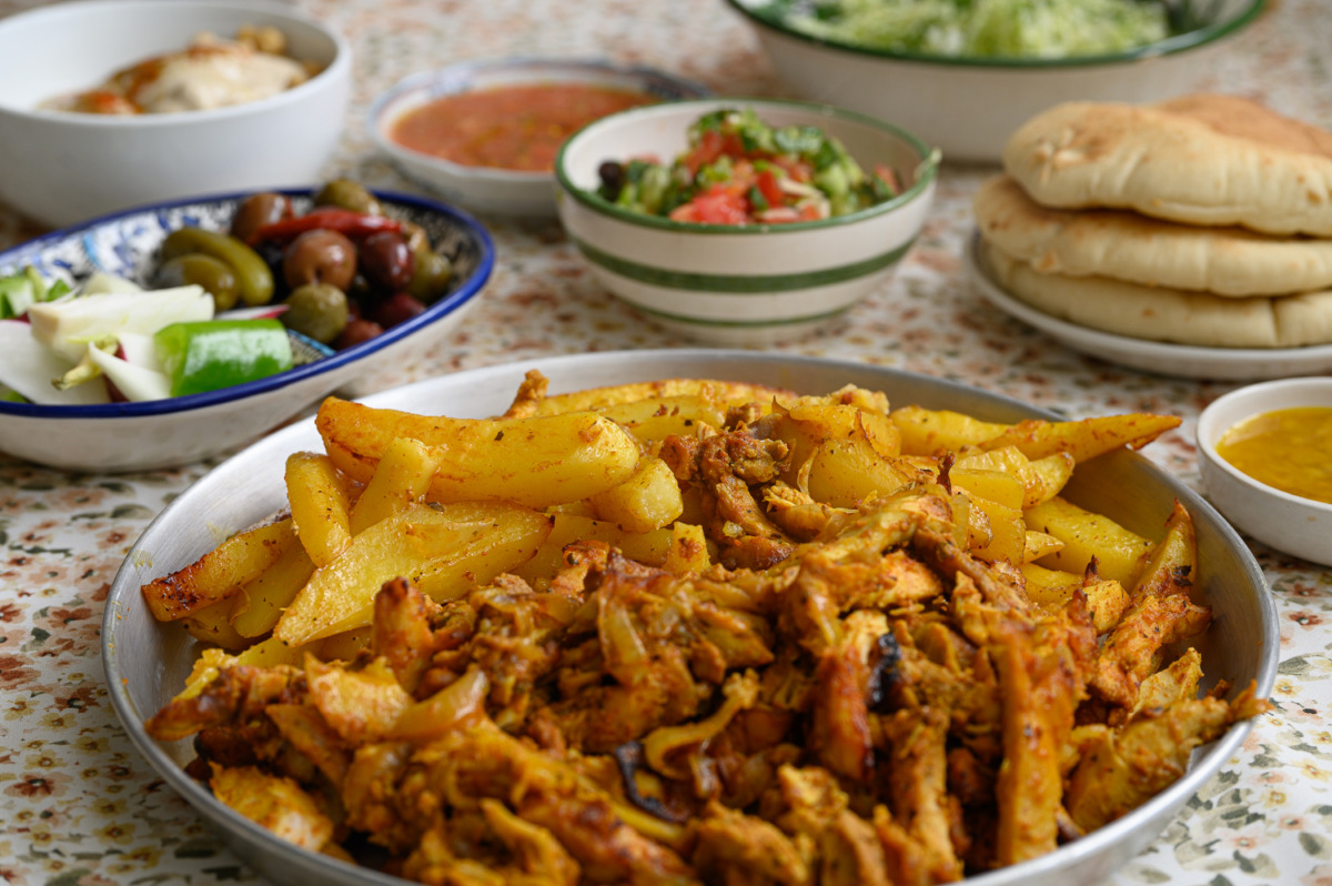 בתבנית מלבנית עם דף אפייה משומן נסדר את שכבת הצ’יפס, מעל השווארמה, נסגור היטב