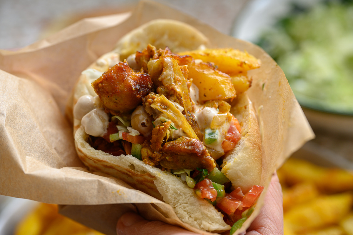 לריקי טריקי של השווארמה בתבנית, אני מוסיפה תפוחי אדמה חתוכים לצ’יפסים בתחתית, הם נהיים רכים ונימוחים. להיט