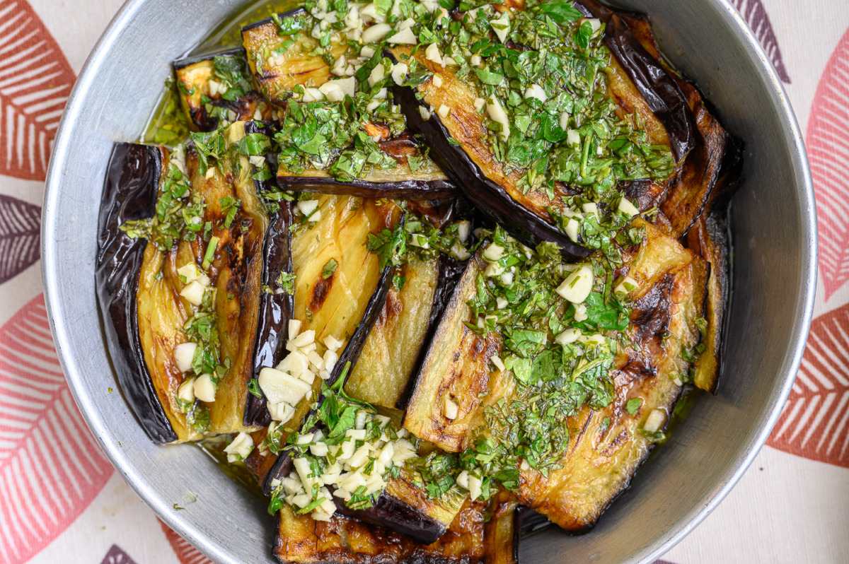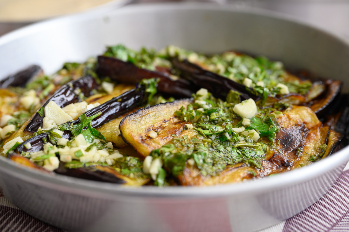 נסדר את החצילים על דף אפייה משומן בנדיבות, נזלף שמן גם ממעל – צד א’ כ-20 דקות, צד ב’ 10 דק’.